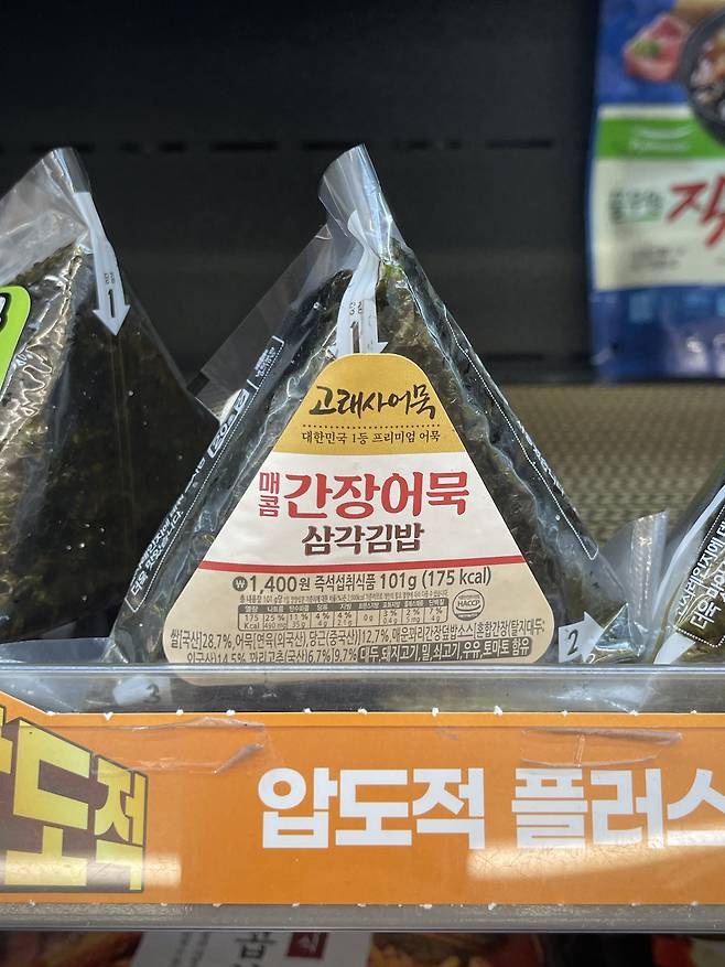 고래사 프리미엄 어묵을 사용해 탱글하고 쫄깃한 식감이 살아있고, 매콤간장 양념이 밥에 배어 있는 소박하면서도 감칠맛 있는 삼각김밥이에요.