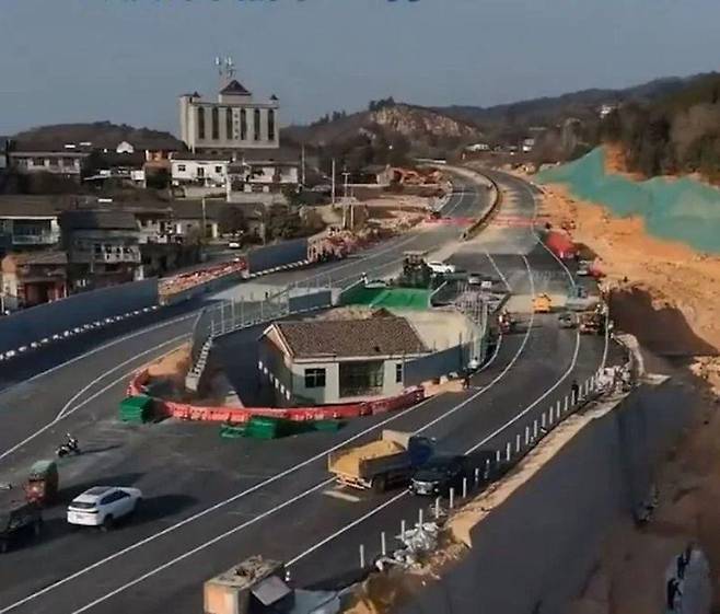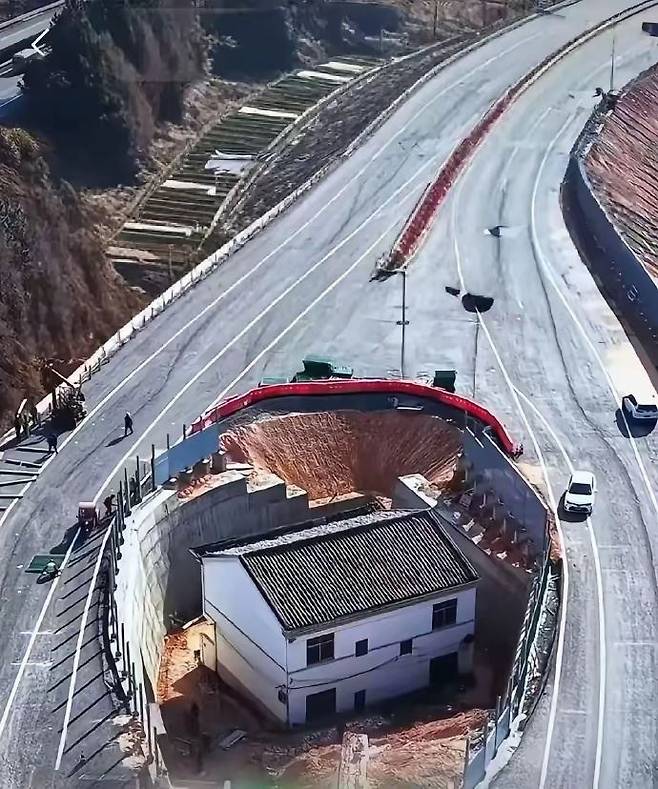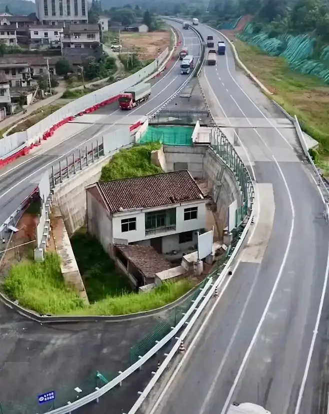 당국은 '알박기'처럼 남아있는 집을 피해 도로를 건설할 수밖에 없었다. 도로는 집을 매끈하게 옆으로 굽은 채 이어졌고, 결과적으로 A씨의 2층집만 도로 위에 우뚝 솟아있는 진풍경이 탄생했다.