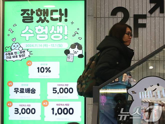 (서울=뉴스1) 임세영 기자 = 2025학년도 대학수학능력시험(수능) 다음날인 15일 서울 중구 명동의 한 상점에 수험생 할인을 알리는 광고가 전광판에 표시되고 있다. 2024.11.15/뉴스1
