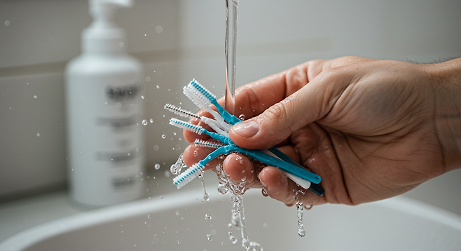 치약 성분이 남아 있으면 치간칫솔이 물러지거나 마모가 빨라질 수 있습니다.