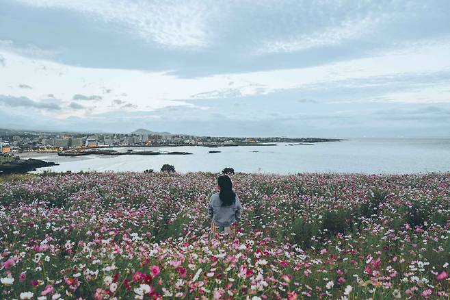 서우봉 입구부터 이어지는 산책길은 길지 않지만 그 어느 곳보다 제주다움을 느끼며 코스모스를 즐길 수 있어요. 바다와 코스모스가 한 프레임 안에 담긴 환상적인 풍경은 제주 최고의 감성 스팟임에 틀림 없죠.
