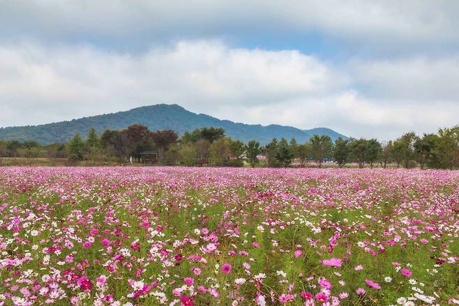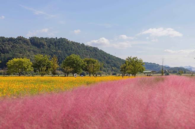 넓은 대지 위에 피어난 코스모스와 핑크뮬리의 구역이 자로 잰 듯 나뉘어져 있어 인생샷 남기기 좋아요. 특히 임진왜란 당시 곽재우 장군이 이끈 의병의 첫 승전지인 기강 전투지와 연결되는 장소여서 역사적으로도 뜻깊은 가을꽃 명소랍니다.