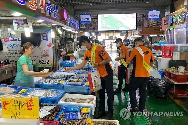 (광주=연합뉴스) 광주 광산구 월곡시장 일원에서 지난 27일 소방 통로 확보를 위한 홍보 활동이 진행되고 있다. 광주 광산소방서는 건물이 밀집한 전통시장에서 불이 나면 큰 인명·재산 피해로 이어질 수 있음을 강조하며 상인, 시민을 대상으로 소방 안전 캠페인을 했다. 신생균 119재난대응과장은 "재난 현장에서 소방력 접근성 향상을 위해 시민의 참여를 부탁드린다"고 말했다. 2022.7.28 [광주 광산소방서 제공. 재판매 및 DB 금지]