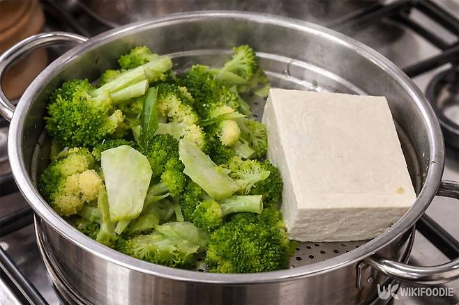 3. 찜기에 브로콜리와 두부를 넣고 물이 끓은 뒤 3분 동안 찐다.