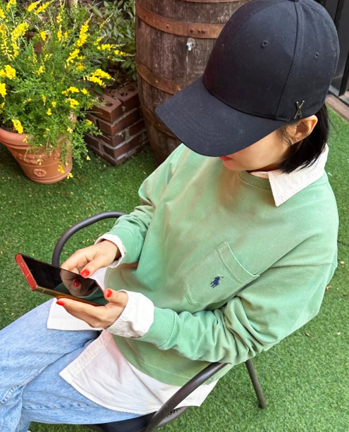 여기에 로고 디테일이 인상적인 블랙 캡과 볼드한 네일 컬러가 대비감을 주며 룩의 포인트가 되었다.