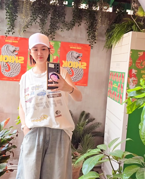 반면 두 번째 스타일링은 오버핏의 그래픽 티셔츠와 와이드 데님 반바지로 보다 자유로운 분위기를 연출했다.