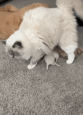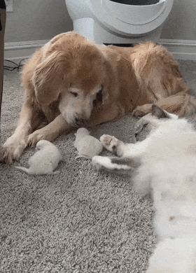 그러던 어느 날, 고양이는 새끼 고양이들을 낳고 골든 리트리버에게 자랑하듯 새끼 고양이들을 보여주었습니다.