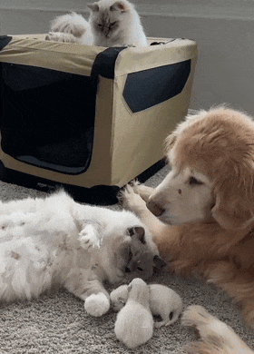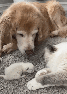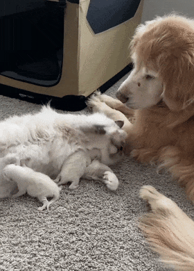 새끼 고양이들은 엄마 품에 안겨 젖을 먹느라 정신없고, 엄마 고양이는 골든 리트리버에게 애교를 부리고, 골든 리트리버는 그저 사랑스러운 눈빛으로 이들을 바라봤습니다.