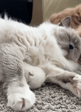 새끼 고양이들의 앙증맞은 모습에 얼굴을 들이대고 냄새를 맡기도 했습니다. 고양이 엄마는 그런 골든 리트리버의 모습이 흐뭇한 듯 옆에서 편안하게 뒹굴었습니다.