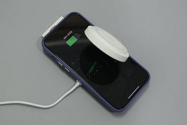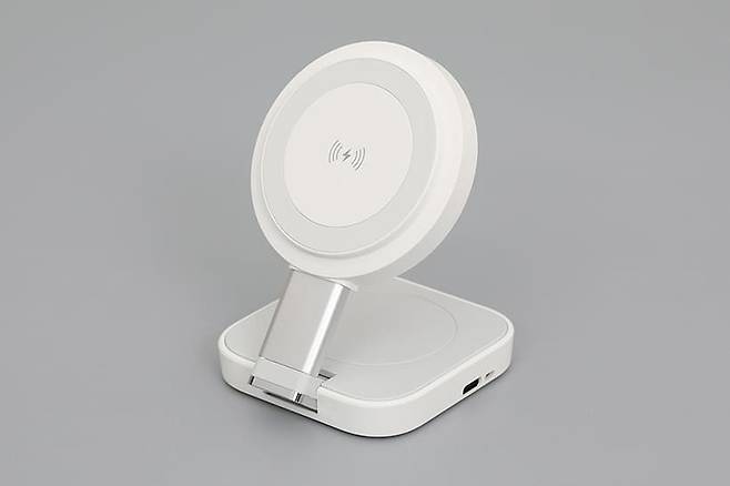 알로코리아 폴더블 맥세이프 무선 충전기 UC315WMS의 위쪽 원판 부분을 들어보면 아래쪽 사각판과 힌지로 연결되어서 최대 60도 각도로 세울 수 있다. 이 부분은 스마트폰 을 충전하기 위한 곳으로, 맥세이프 무선충전을 위해 마그네틱이 내장되어 있다.