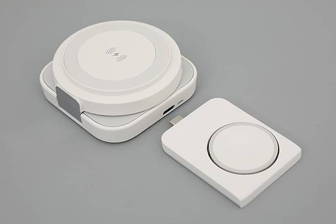 평소 개인적으로 잠들기 전 반드시 충전을 해야 하는 기기를 꼽자면 스마트폰과 스마트워치, 그리고 블루투스 이어폰이다. 이것만 해도 벌써 세 개의 충전 어댑터를 써야 해서 4구 멀티탭을 쓰면 한 구만 남게 되고, 멀티포트 USB 충전기를 써도 USB 포트를 세 개나 차지하게 된다. 태블릿PC와 핸디용 선풍기 등 충전할 기기가 많다면 멀티포트 충전기도 부족한 상황이 될 수 있는데, 알로코리아 폴더블 맥세이프 무선 충전기 UC315WMS만 있으면 단 하나의 포트로 스마트폰과 스마트워치, 그리고 블루투스 이어폰까지 동시에 충전할 수 있다.