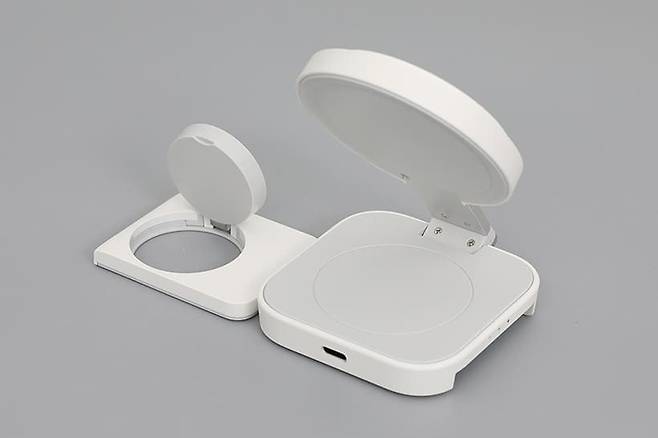 알로코리아 폴더블 맥세이프 무선 충전기 UC315WMS의 스마트폰 충전패드를 세워두고 스마트워치 충전패드도 연결한 상태는 다음과 같은 모습이 된다. 앞서 설명한 바와 같이 뒤쪽 공간은 무선충전을 지원하는 블루투스 이어폰을 충전하는 공간이다.