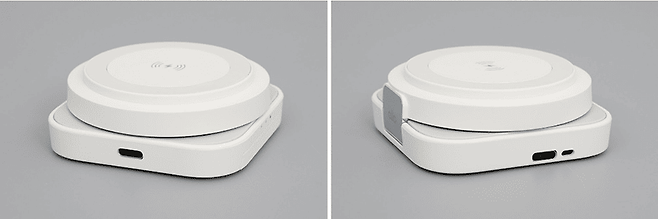 우리가 앞서 알로코리아 폴더블 맥세이프 무선 충전기 UC315WMS의 외형을 살펴볼 때 본체 오른쪽 측면에 USB C타입 포트와 타원형 구멍이 나란히 있는 것을 보았는데, 이 곳에 분리된 파트가 정확하게 끼워진다.