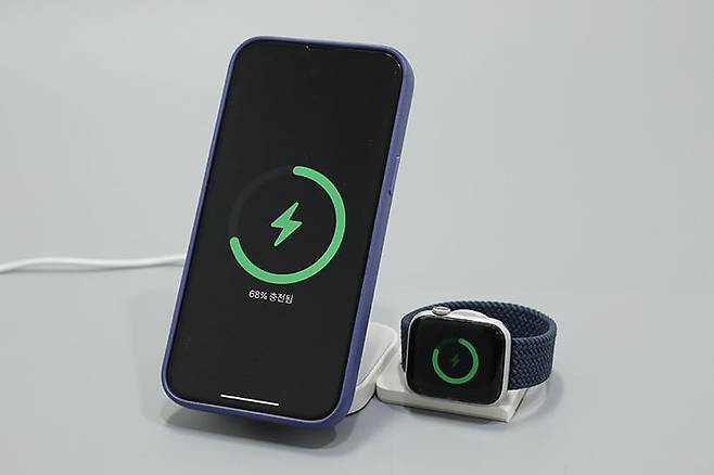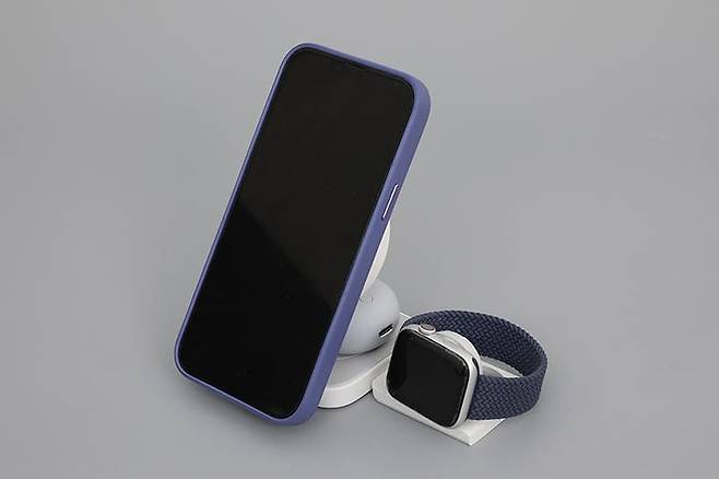 알로코리아 폴더블 맥세이프 무선 충전기 UC315WMS의 스마트폰 충전패드를 세워두고 스마트워치 충전패드도 연결한 상태는 다음과 같은 모습이 된다. 앞서 설명한 바와 같이 뒤쪽 공간은 무선충전을 지원하는 블루투스 이어폰을 충전하는 공간이다.
