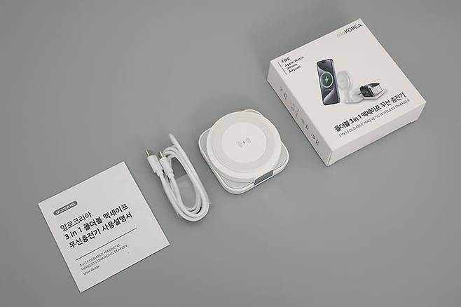 박스 안에는 구성품으로 알로코리아 폴더블 맥세이프 무선 충전기 UC315WMS 본체와 USB 케이블, 그리고 사용 설명서가 담겨 있다. USB 케이블은 CtoC 케이블로, 최대 60W를 지원하는 제품이 제공된다.