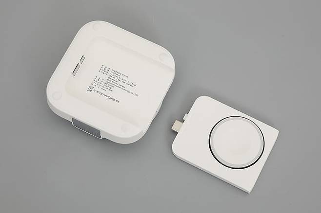 본체 바닥면에 분리한 뒤 옆면에 끼워 넣은 파트는 스마트워치 충전패드로, 원형 충전부를 눕혀서 충전하거나 세워서도 사용할 수 있다. 단, 스마트폰과는 달리 스마트워치의 무선충전은 표준화되지 않았기 때문에 본 모델의 경우 애플워치만 지원하고 있다.