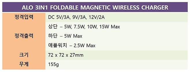 상단의 스마트폰 충전패드는 최대 15W까지 지원되기 때문에 고속충전이 가능하며, 애플워치 충전패드는 최대 2.5W, 하단 이어폰 충전패드는 최대 5W까지 지원된다.