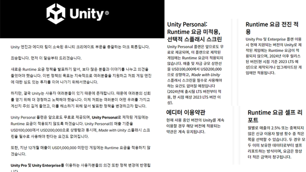 글로벌 게임 엔진 기업 유니티 테크놀로지스(이하 유니티)가 기존 요금제를 설치 횟수 당 과금되는 '런타임 요금제'로 바꾸겠다는 새로운 정책이 기업들의 강한 반발에 가로막히자 일부 이용자에만 적용하는 방향으로 수정하며 한발 물러났다.