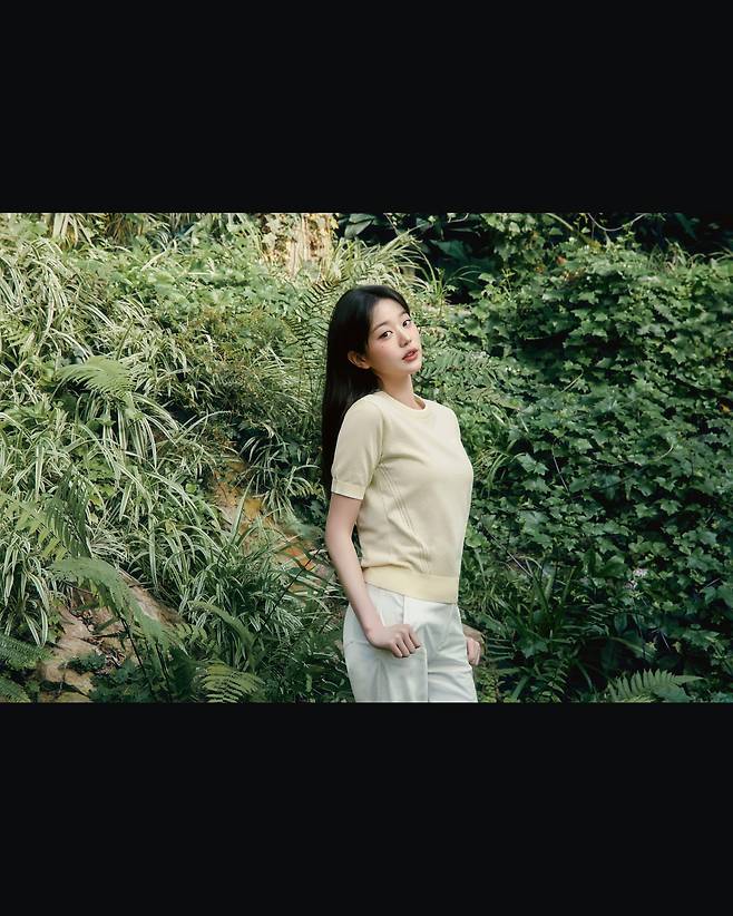 두 번째 룩에서 장원영은 자연 속에서 미니멀한 우아함을 선보이고 있다. 파스텔 옐로우 컬러의 심플한 니트 톱과 화이트 와이드 팬츠의 조합은 세련된 미니멀리즘을 대표하고 있다. 깔끔한 실루엣과 부드러운 컬러 매치는 푸른 식물 배경과 자연스럽게 조화를 이루며, 꾸미지 않은 듯한 내추럴 메이크업과 자연스럽게 흐르는 긴 머리는 전체적인 룩의 청순함을 강조하고 있다.