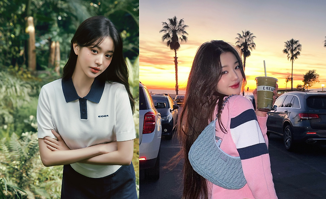 장원영은 캘리포니아의 아름다운 석양을 배경으로 트렌디한 Y2K 감성을 연출하고 있다. 핑크, 네이비, 화이트 컬러가 조화를 이룬 스트라이프 니트 스웨터를 착용해 경쾌한 분위기를 자아내고 있다. 여기에 연청색 크로셰 백을 매치해 복고풍 감성을 더했으며, 손에 들고 있는 그린 스무디는 캘리포니아의 건강한 라이프스타일을 상징하는 소품으로 활용되고 있다. 야자수가 늘어선 주차장에서의 이 컷은 서부 해안의 여유로운 분위기와 장원영의 밝은 에너지가 완벽하게 어우러진 순간을 포착하고 있다.