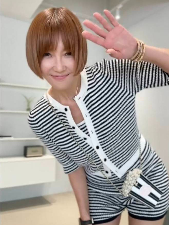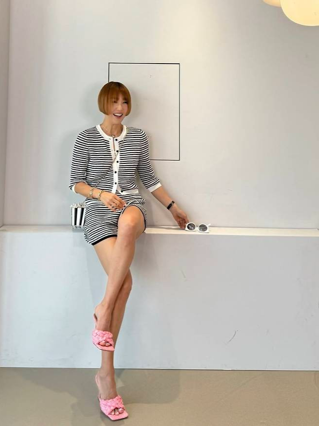 흑백 스트라이프 패턴의 니트 셋업에 앙증맞은 핑크 뮬 힐을 더한 그녀는 단순하지만 감각적인 스타일링으로 시선을 사로잡았습니다.