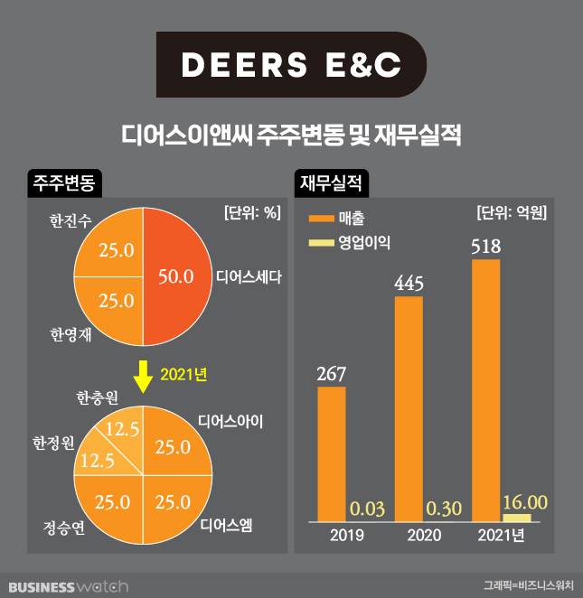 노루페인트의 한영재 회장이 장남인 한원석(36) 노루홀딩스 전무의 대물림에 부쩍 열을 내고 있는 요즘 한진수 회장 또한 E&C를 기반으로 본격적으로 후계승계에 나섰다고 볼 수 있다. 특히 올해 7월에는 한충원씨가 E&C 이사회에 디어스 계열 중 처음으로 합류하기도 했다.