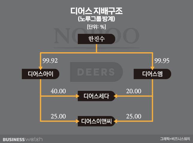 창업주 2세들의 분가(分家)와 무관치 않다. 2대 경영자 한영재(67) 회장의 둘째 남동생 한진수(65) 디어스 회장이 주인이다. 계열명을 달리 ‘노루’의 영어 표기 ‘DEER’S’로 한 게 아니다.