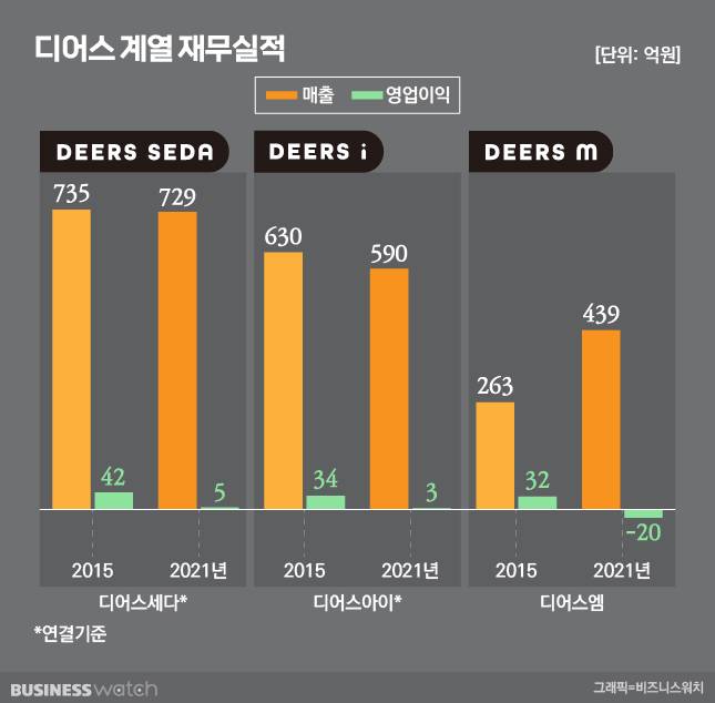 심상찮다. 디어스 계열은 기업 볼륨 치고는 비교적 쏠쏠하게 벌어왔지만 2010년대 후반 들어 시원찮아지고 있다. E&C를 뺀 3개사의 합산 매출이 2015년 1630억원, 2021년 1760억원이다. 정체 양상이다. 특히 영업이익은 108억원에서 매년 예외 없이 감소하며 작년에는 계열사별로 많아봐야 5억원에 머물렀다. 엠은 20억원 적자로 돌아섰다.