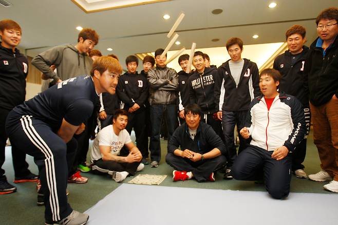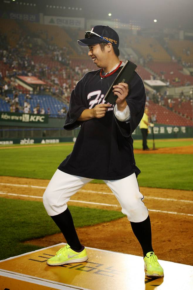 오히려 유희관의 재능이 먼저 빛났던 곳은 마운드가 아니라 회식 자리나 장기자랑 무대. 두려움 없는 무대 체질에 입만 열면 모두가 쓰러졌다. 압도적인 구속 대신 압도적인 입담으로 두산 선수단을 초토화했다. 그래서 ‘유희왕’이라는 별명이 붙었다.