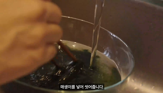매생이가 모두 잠길 정도로 큰 볼에 물을 담아 준비하고 매생이를 넣어 씻어줍니다. 물에 뜨는 불순물들을 제거하며 빠르게 씻어줍니다. 너무 오래 물에 넣어두면 바다향이 날아가니, 살짝만 헹구듯 씻어주세요!