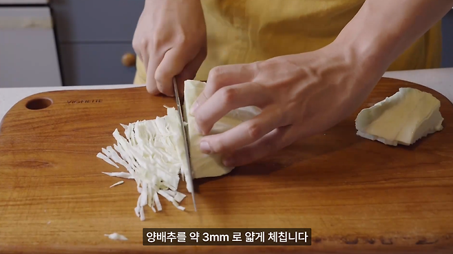 양배추를 약 3mm로 얇게 채를 썹니다.