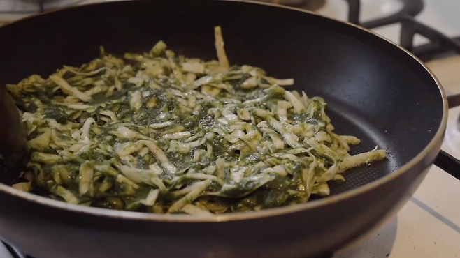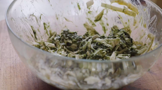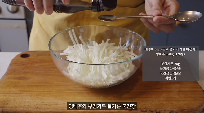 양배추와 부침가루, 물, 들기름, 국간장, 계란을 넣어 모두 함께 잘 섞어줍니다. 가루가 들어가기 전에 먼저 살짝 섞어준 후에 부침가루를 넣어주면 좋습니다. 다진 매생이를 넣을 때는 매생이가 한쪽으로 뭉치지 않도록 꼼꼼히 섞어줍니다.