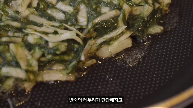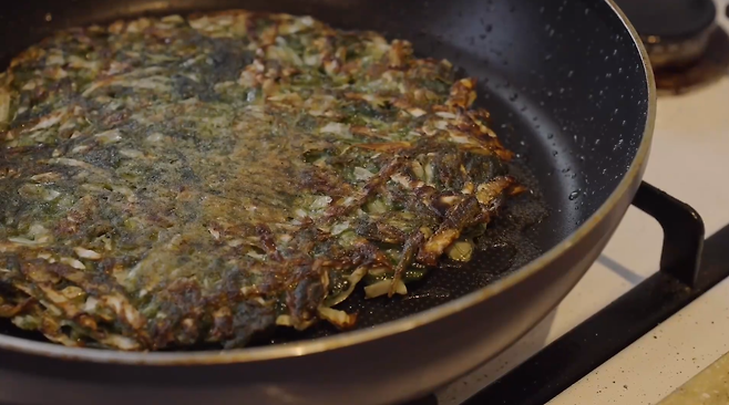 반죽의 테두리가 단단해지고 노릇노릇해지면 반죽을 뒤집어서 구워줍니다.