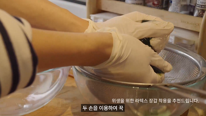 매생이를 체에 받쳐 물기를 빼내고 두 손을 이용하여 물기를 짜줍니다. 물기를 짤 때에는 위생을 위해 라텍스 장갑을 끼는 것을 추천드려요.