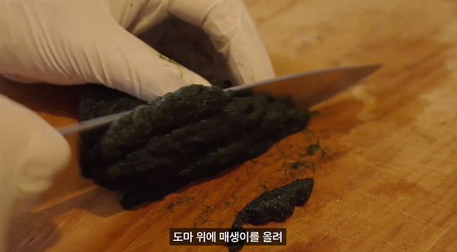 도마 위에 매생이를 올려 잘게 다집니다. 잘게 다지는 이유는 나중에 구워서 먹을 때 입에 걸리는 게 없게 하기 위함이에요.