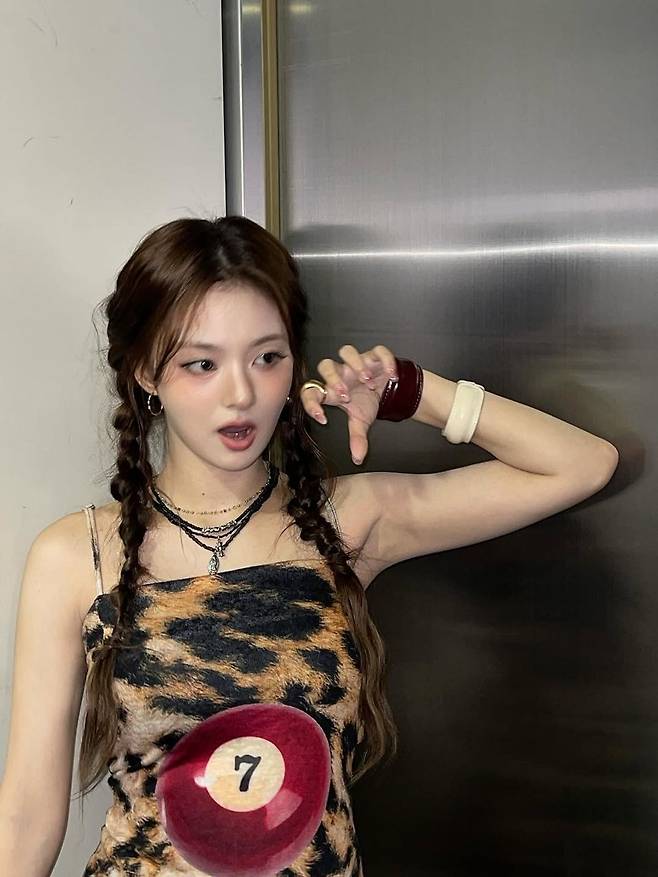 착장의 중심은 단연 레오파드 프린트의 슬립 드레스다. 몸에 핏되게 떨어지는 실루엣이 이나경의 슬림한 바디라인을 강조하며, 가슴 아래쪽에 큼지막하게 박힌 레드 컬러의 7번 당구공 프린트가 위트 있는 포인트를 더한다. 이 유니크한 디테일은 복고풍 스포츠 감성을 자극하며, 전형적인 Y2K 패션의 재해석이라 할 수 있다.