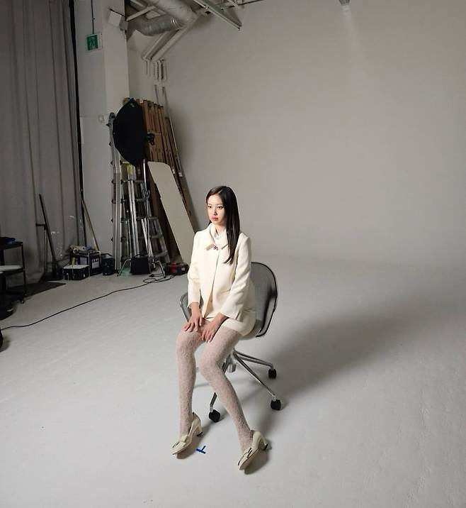 최리는 화이트 재킷과 레이스 패턴의 타이츠를 매치해 우아하면서도 독특한 분위기를 연출했다. 여기에 크림색 로퍼를 더해 전체적인 톤을 맞추며 차분한 이미지를 강조했다. 심플한 배경 속에서 돋보이는 이 스타일은 깔끔하면서도 개성을 살린 포인트가 돋보인다.