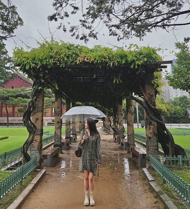 비 오는 날 우산을 들고 선 최리는 플로럴 패턴의 미니 원피스와 앵클 부츠를 매치해 로맨틱한 무드를 완성했다. 자연 속에서 어우러지는 이 스타일은 여성스러움과 편안함을 동시에 담아냈다. 특히 부츠의 베이지 톤이 전체적인 룩에 안정감을 준다.