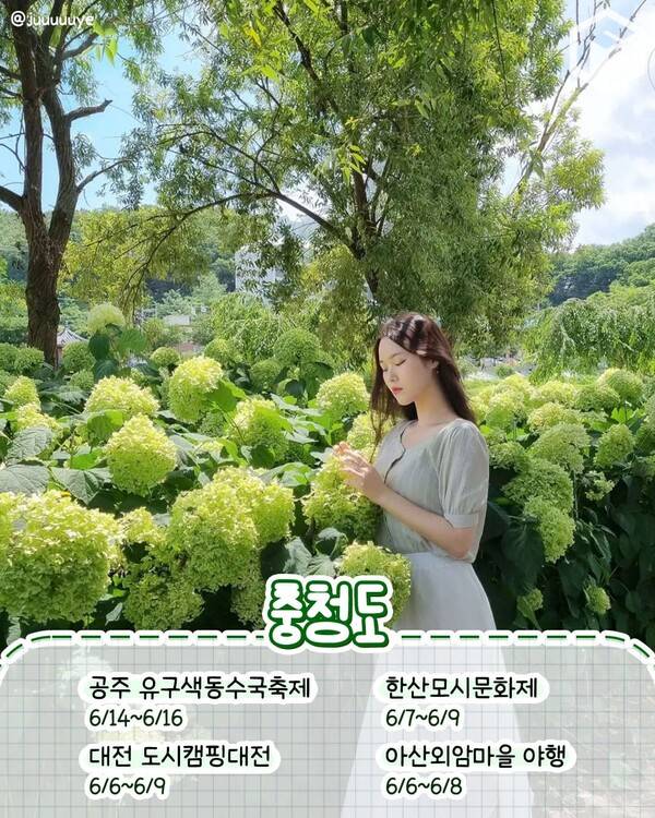 충청 공주에는 수국 명소로 잘 알려져 있는 유구색동수국정원이 있습니다. 벌써 수국이 만발했다는 소식이 들려오는 유구색동수국정원의 수국축제는 6월 14일부터 16일까지 3일간 진행됩니다. 대전에서는 도시캠핑대전이 펼쳐지는데요. 다가오는 여름과 가을, 캠핑에 관심이 있으신 분들이라면 방문해보시길 바랍니다.