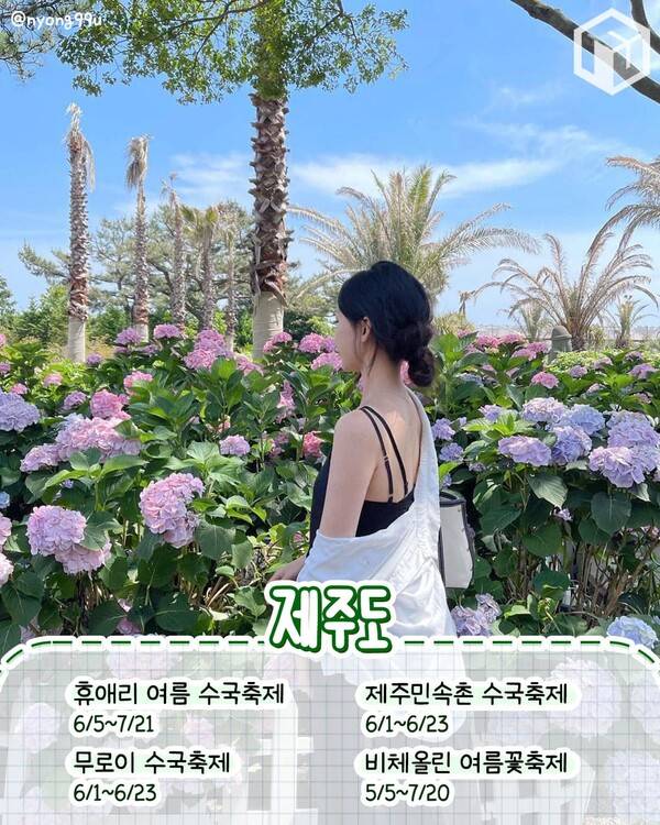 제주도의 6월 축제는 여름꽃으로 가득 채워질 예정입니다. 여름꽃을 대표하는 수국과 능소화가 벌써 제주 곳곳에서 개화 소식을 알리고 있는데요. 제주 곳곳의 수목원과 테마파크는 물론, 정원을 보유한 대형 카페 등에서 약 한 달 간 수국 축제를 진행합니다.