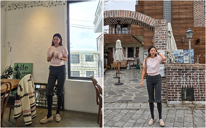퍼프소매 니트와 러플 디테일의 팬츠로