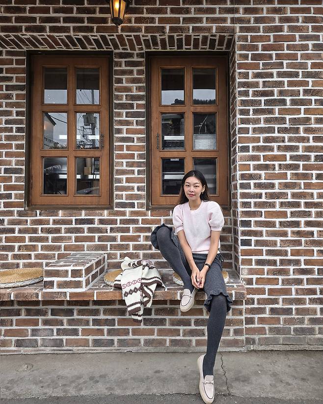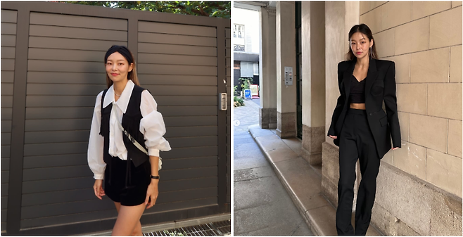 베이비핑크와 차콜 컬러 의상 조합에