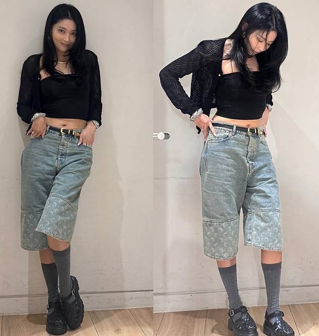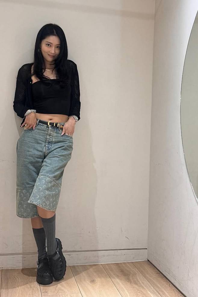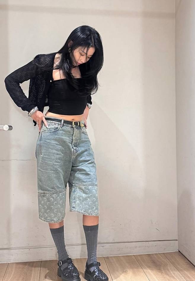 청바지 스타일의 반바지를 착용해 여름철에도 시원하고 스타일리시한 룩을 연출했습니다.