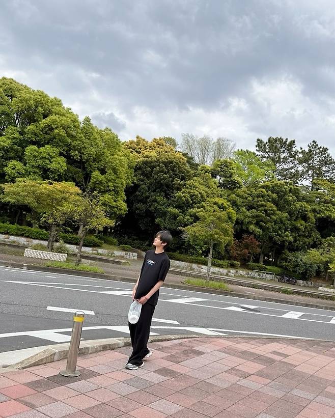 김규빈이 선택한 티셔츠에는 달 모양이 나열된 그래픽과 레터링이 포인트로 들어가 있어 심플한 블랙 스타일에 위트를 더했다. 하의는 발등을 덮는 긴 기장의 블랙 와이드 팬츠로, 티셔츠와 자연스럽게 이어지는 통일감을 주며 전체적인 균형을 맞췄다. 여기에 심플한 스니커즈를 더해 편안한 무드를 극대화했다.