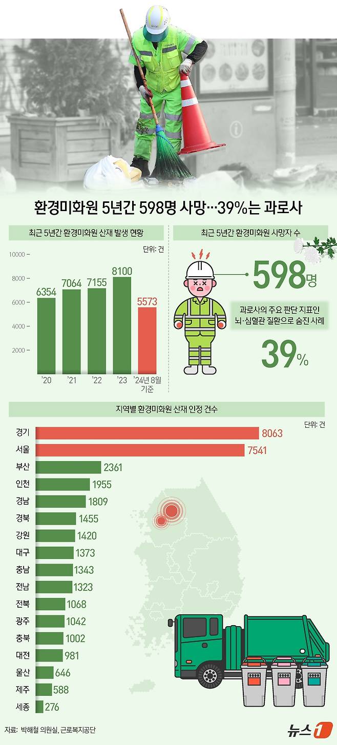 [오늘의 그래픽] 환경미화원 5년간 598명 사망…39%는 과로사