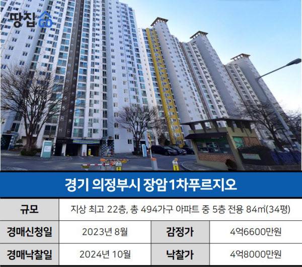 해당 물건은 의정부시 장암동 ‘장암1차푸르지오’ 아파트 5층, 전용면적 84㎡. 2004년 입주한 총 494가구로, 의정부 경전철 1호선 발곡역까지 걸어서 5분 거리인 역세권 아파트다. 경전철을 타고 한 정거장만 이동하면 의정부와 서울을 직결하는 지하철 1호선 회룡역에 도착해 교통이 나쁘지 않다는 평가를 받는다.
