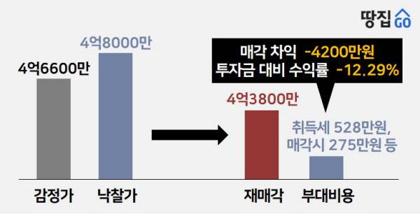 그러나 B씨는 이 아파트를 손에 넣은 지 6개월여만인 올 3월 4억3800만원에 되팔았다. 낙찰가와 비교하면 4200만원 낮다. 세금·중개수수료 등 부대비용을 감안한 실제 손실은 6000만원에 달할 것으로 추산됐다.