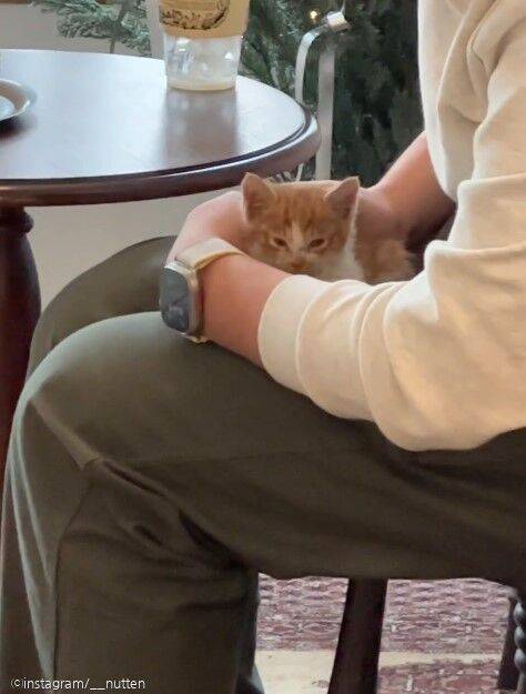 결국 추운 밖에 계속 냅둘 수 없다고 생각한 사장님이 고양이를 카페로 들였다. 그때 당시 같이 있던 손님들이 무릎에 재워주기도 했다고.