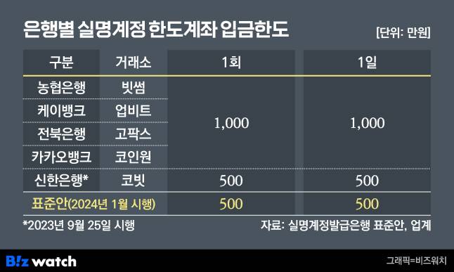 먼저 업비트, 빗썸 등 가상자산 거래소와 연결된 시중은행 한도계좌의 원화 입금한도가 현재 1일 1000만원에서 500만원으로 대폭 줄어든다. 기존에는 은행마다 입출금 한도가 달랐으나, 당국과 시중은행이 '실명계정 운영지침'을 마련해 1월부터 거래소와 연결된 모든 은행에 공통 적용한다.