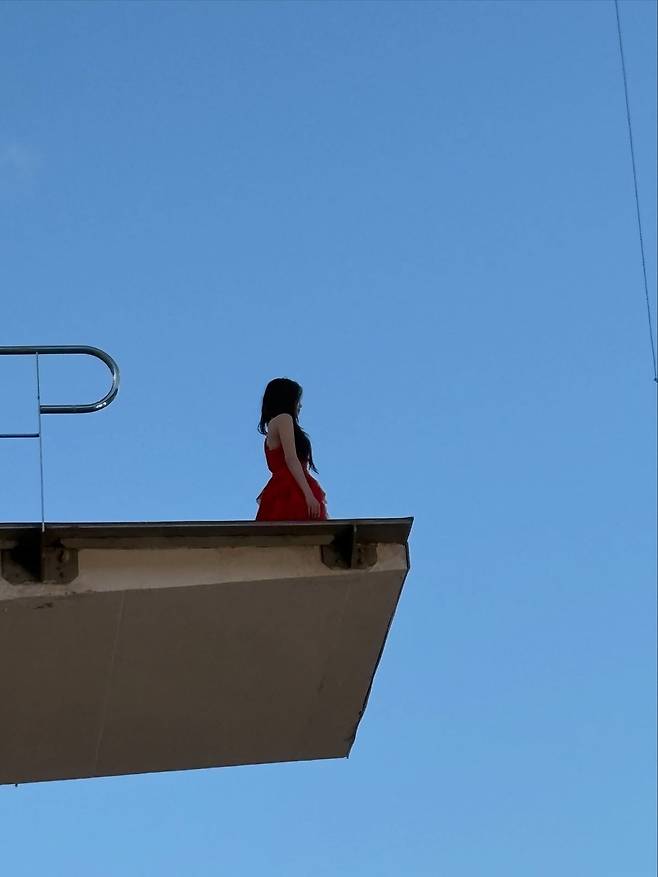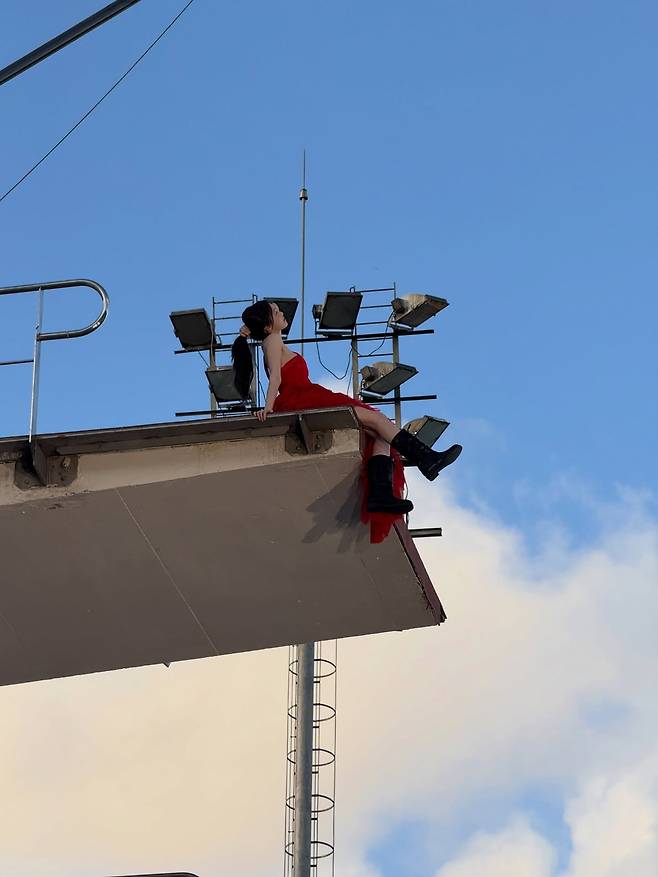 어깨 라인을 시원하게 드러내는 디자인을 선택해서 그녀의 가녀린 선을 강조함과 동시에, 드레스의 붉은 빛이 푸른 하늘과 보색 대비를 이루어 주변 풍경조차 하나의 화보처럼 보이게 만들었죠.